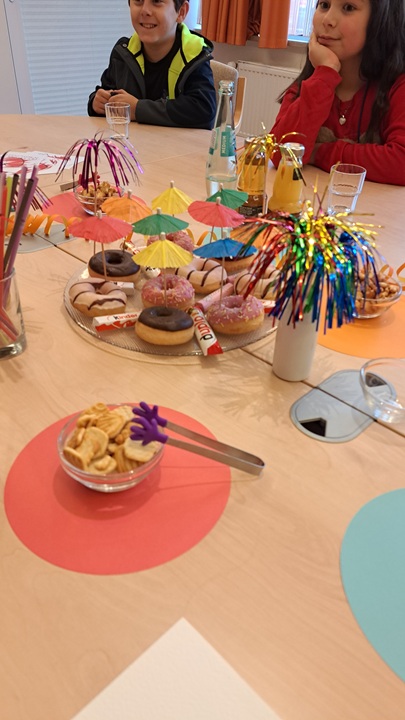 Nach einem Fußmarsch quer durch die Stadt werden wir herzlich von Lukas Weiß und Michaela Rausch empfangen und in einem Raum wartet sogar ein festlich geschmückter Tisch auf uns. Wir erzählen, dass wir der Trostinsel gern spenden würden, weil sie schon vielen Kindern an unserer Schule geholfen hat, mit ihrer Trauer umzugehen. Wir fragen viel: Sind hier schon viele Menschen gestorben? Darf man sein Haustier mit herbringen? Darf man auch zur Trostinseln, wenn man traurig wegen eines verstorbenen Haustieres ist? …und vieles mehr. Herr Weiß und Frau Rausch erklären geduldig, fragen nach und hören zu, wir fühlen uns rund herum wohl und dürfen uns mit all den leckeren Dingen auf dem Tisch stärken, die als Dankeschön für unsere Spende für uns bereitliegen.