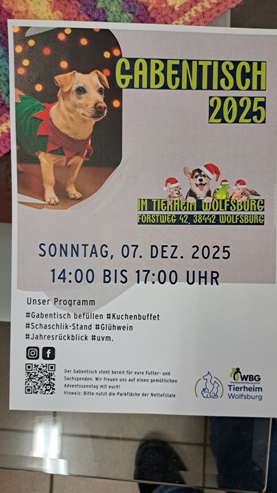 Als Spende wird sehr gern auch Katzennassfutter genommen, je mehr Fleischanteil desto besser. Mit Textilien ist das Tierheim zur Zeit gut versorgt, wer aber etwas tun möchte ist herzlich am 7.12.25 ab 14.00 Uhr zum Gabentisch befüllen eingeladen.